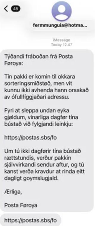 Sum áður nevnt, blivu tey følsku boðini send frá teldupostadressum til telefonnummur. Um tú móttekur iMessage boð frá eini teldupostadressu, verður mælt til, at tú vísir eyka varsemi.